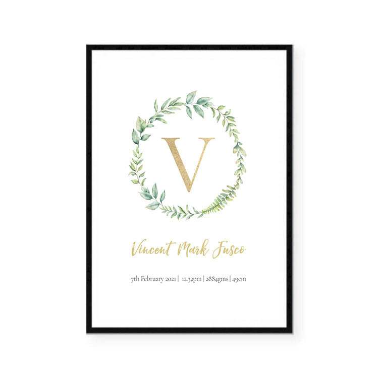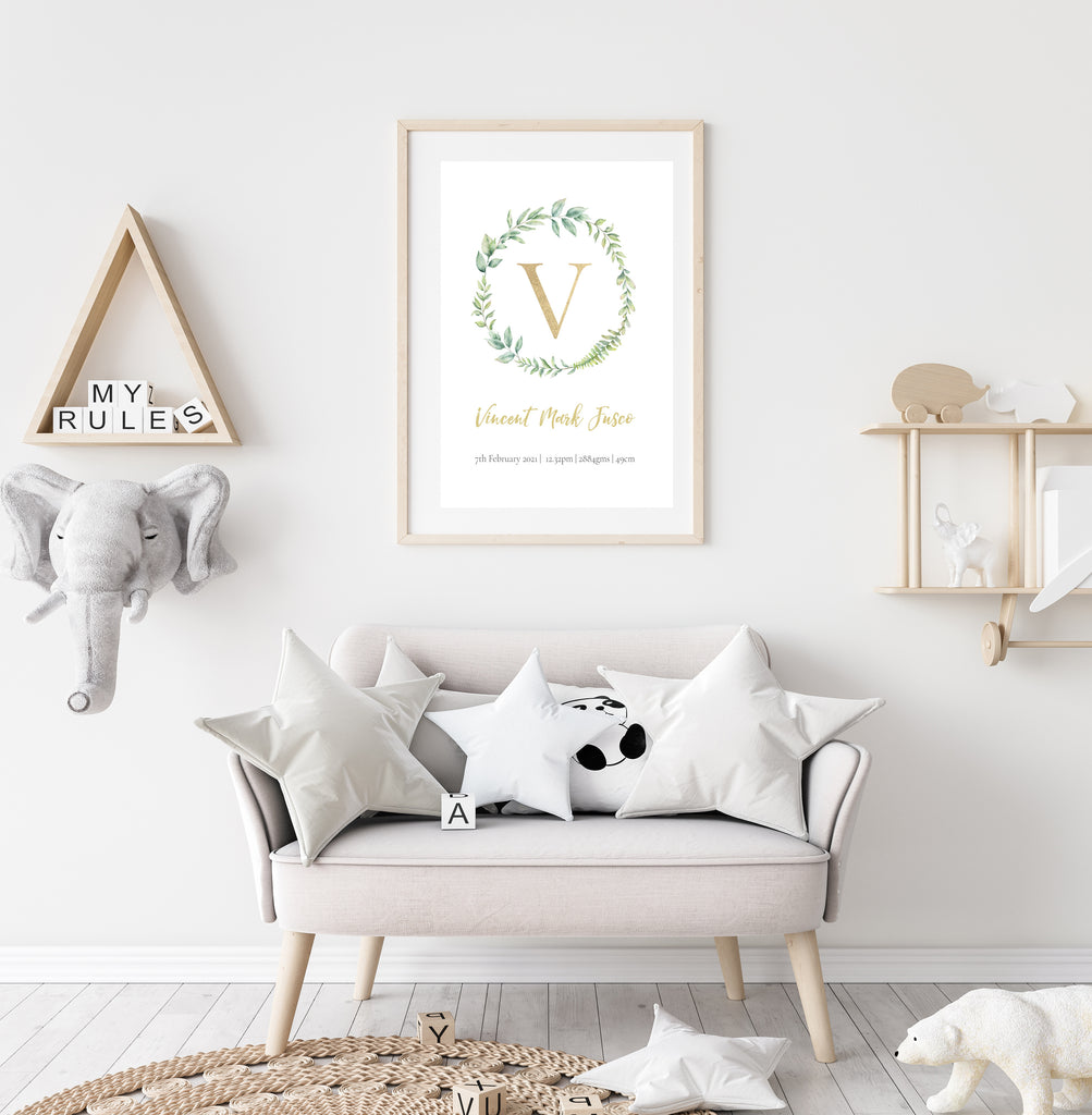 Personalize your child’s room with this custom birth print in an on trend watercolour leaf wreath design with gold foil accents. It includes your child’s birth details such as, name, weight, date of birth and place of birth.