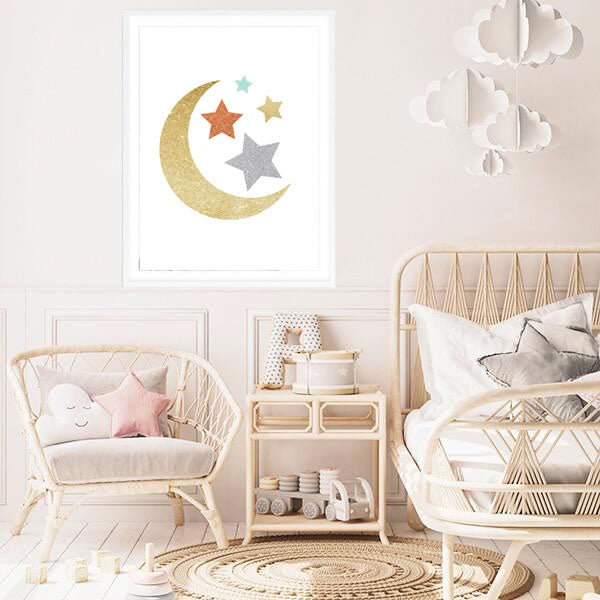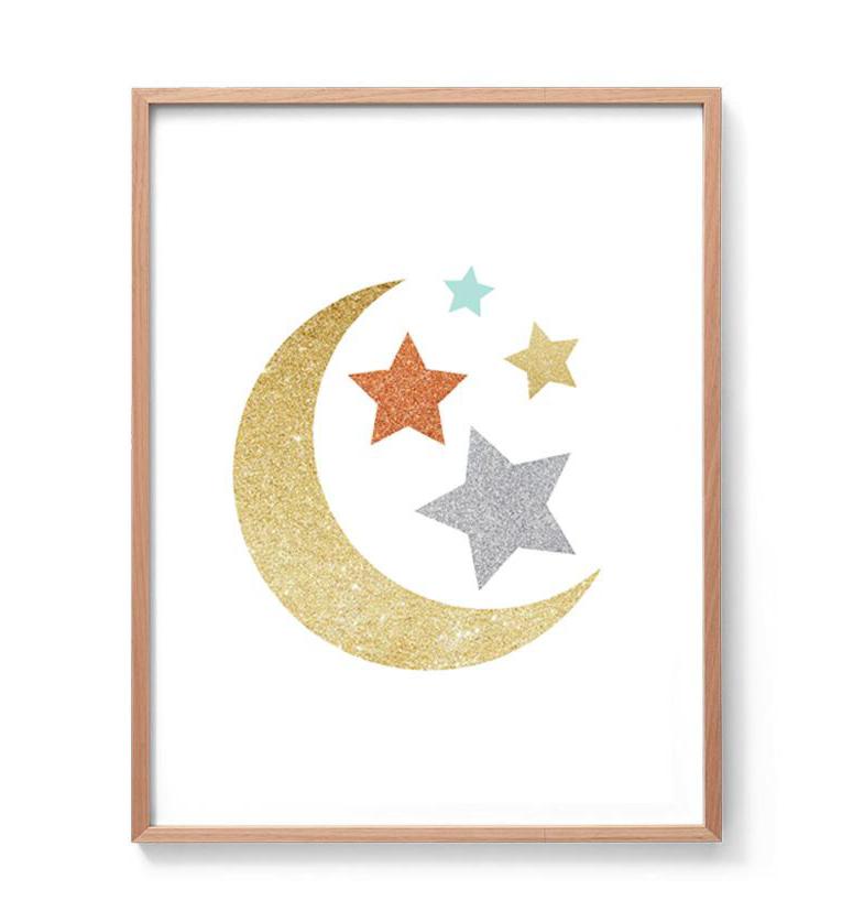 Moon And Stars Gold And Silver Sparkle Glitter Print